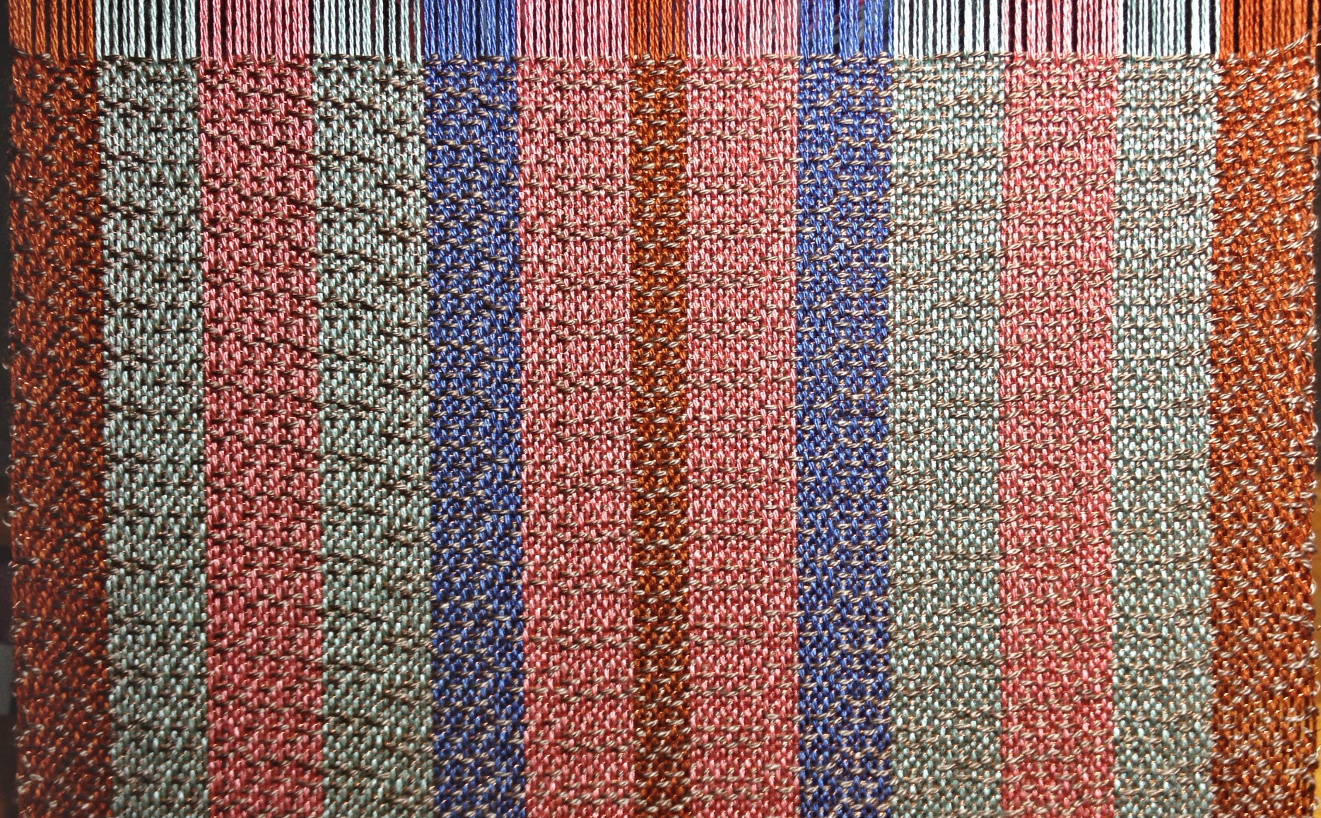 Southwest Glint Warp 8/2 Tencel, Weft pattern 8/2 Tencel, Tabby metallic covered yarn 220 D Leave a comment Cancel reply Δ