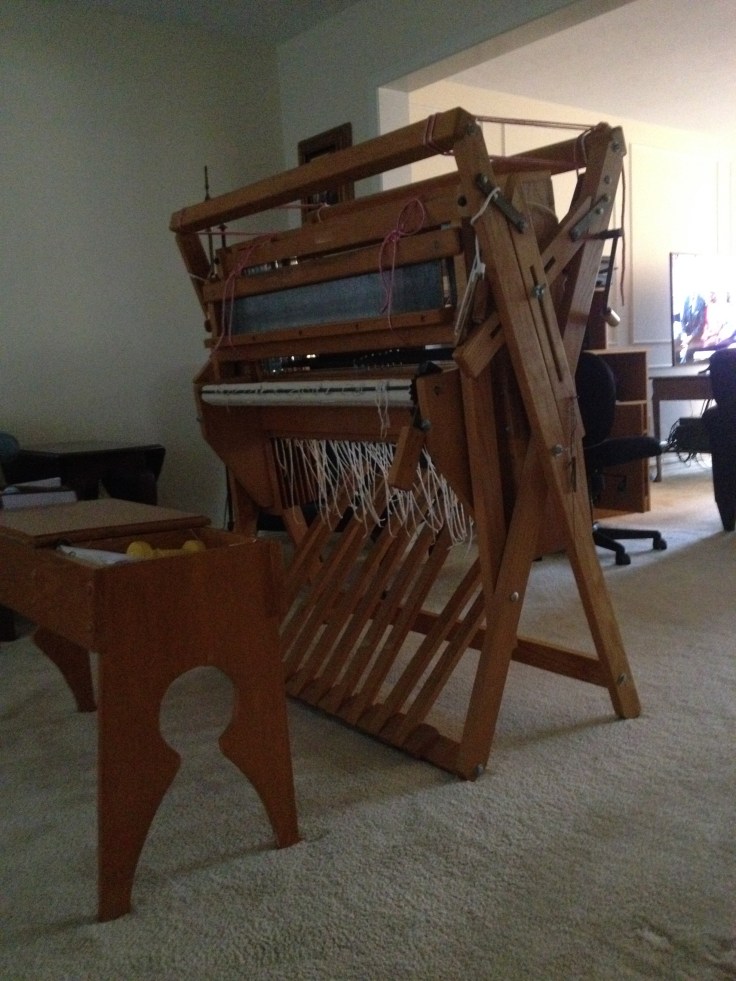 It’s hard to weave when your loom is folded up. The loom is waiting to be moved out of the room while the carpet padding is replaced. Then the existing carpet will be re-laid and cleaned. It has been a very unproductive time.