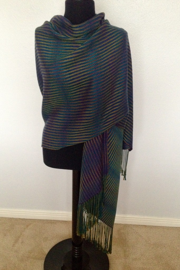 The weather has been cold and dreary. The lack of sunshine makes photography very difficult. The above shawl is a 12 shaft advancing twill, woven with 8/2 Tencel. Two colors in the warp and 1 in the weft. I love the movement the pattern creates. After I wove it though I couldn’t decide what side I liked better.