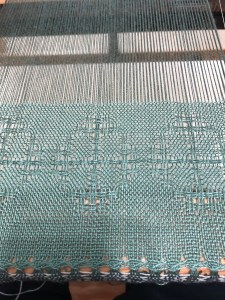 It’s been a while since I’ve woven any Huck Lace. A new to me pattern this one is from “Weavers Best Huck Lace.” This pattern is by Dini Cameron, page 17. Huck Lace shows up best when a solid color is used in both the warp and weft. This is a scarf of 8/2 Lyocell (Tencel), sett at 20 epi. There are 3 motifs across the scarf.