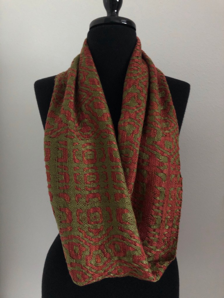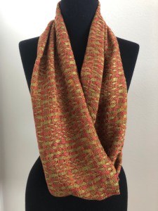 This mobius and the one at the beginning of the post were woven using designs from the book “Double with a Twist” by Marian Stubenitsky. They were woven with 8/2 Tencel in the warp and weft . Yarns from Webs. A 5 yd warp of 240 ends, sett 20 ends per inch, gave me 3 mobius’s.