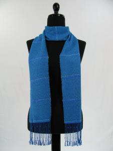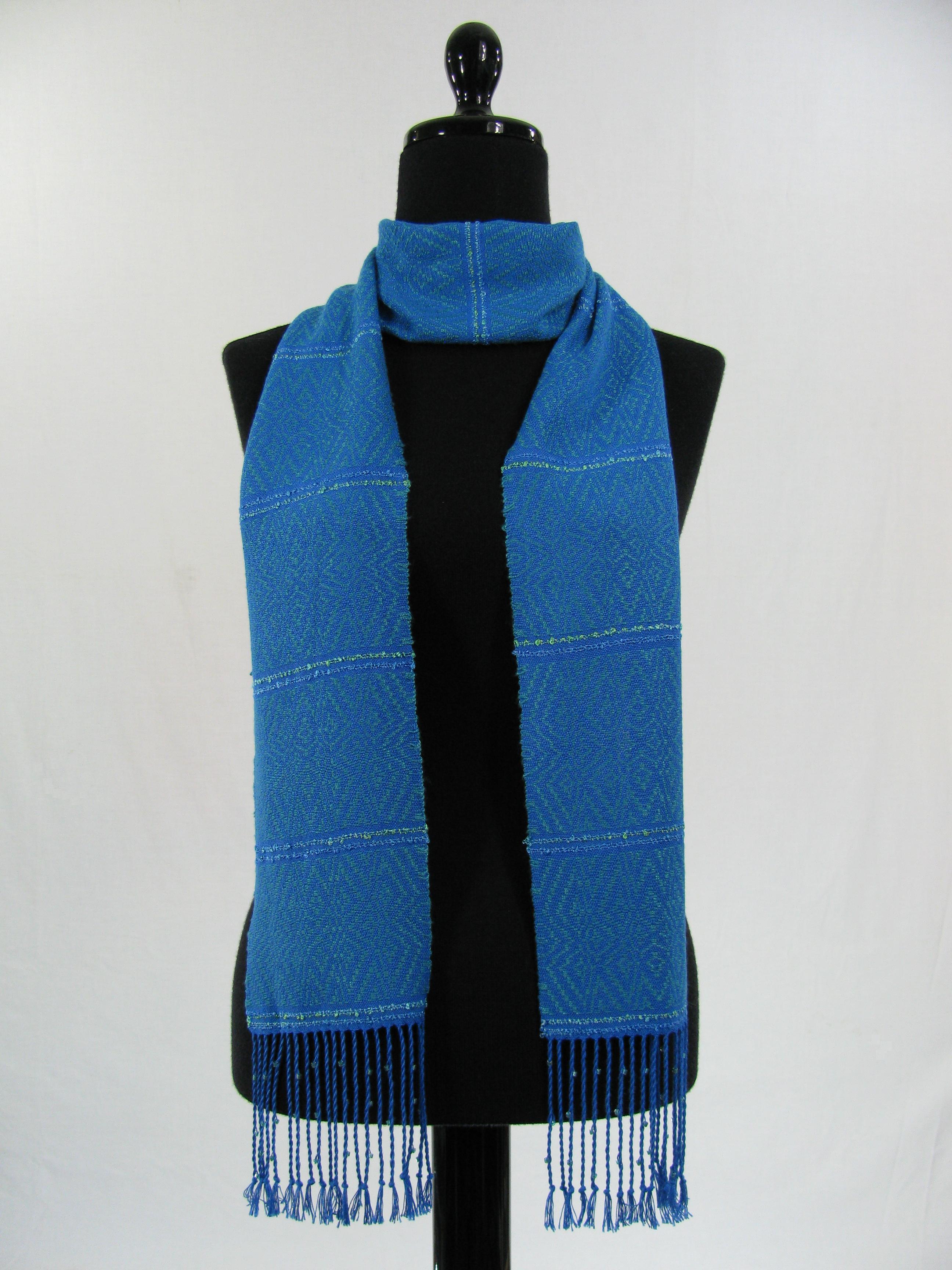 Handwoven overshot weave Scarf, with twisted fringe and beads. Inspired by Bertha Hayes pattern. Fiber: Bamboo, Rayon. 6 x 72 inches.