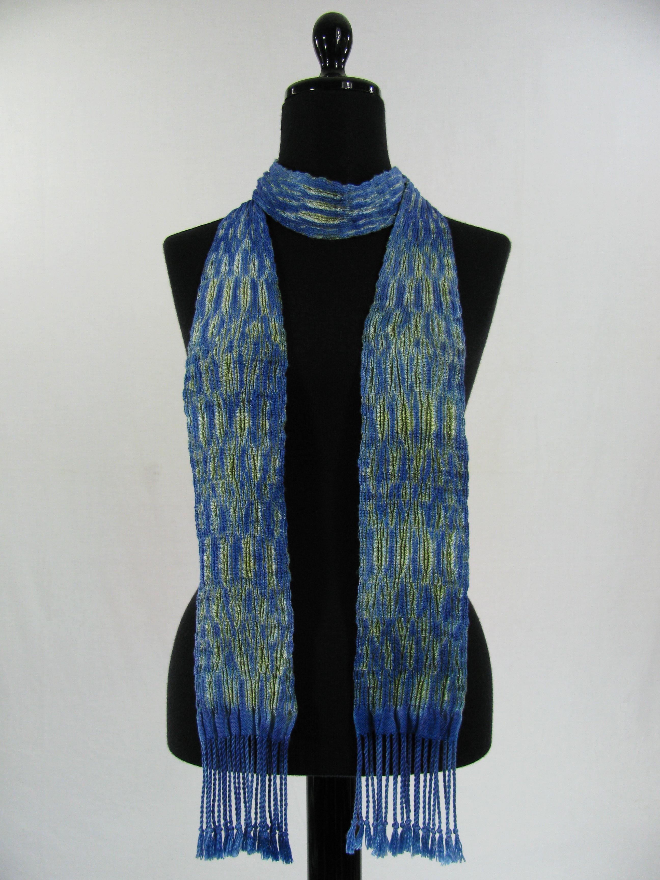 Handwoven Shibori, Hand dyed, with twisted fringe. Fiber Content: Bamboo and Tencel.4 x 73 inches collapsed.