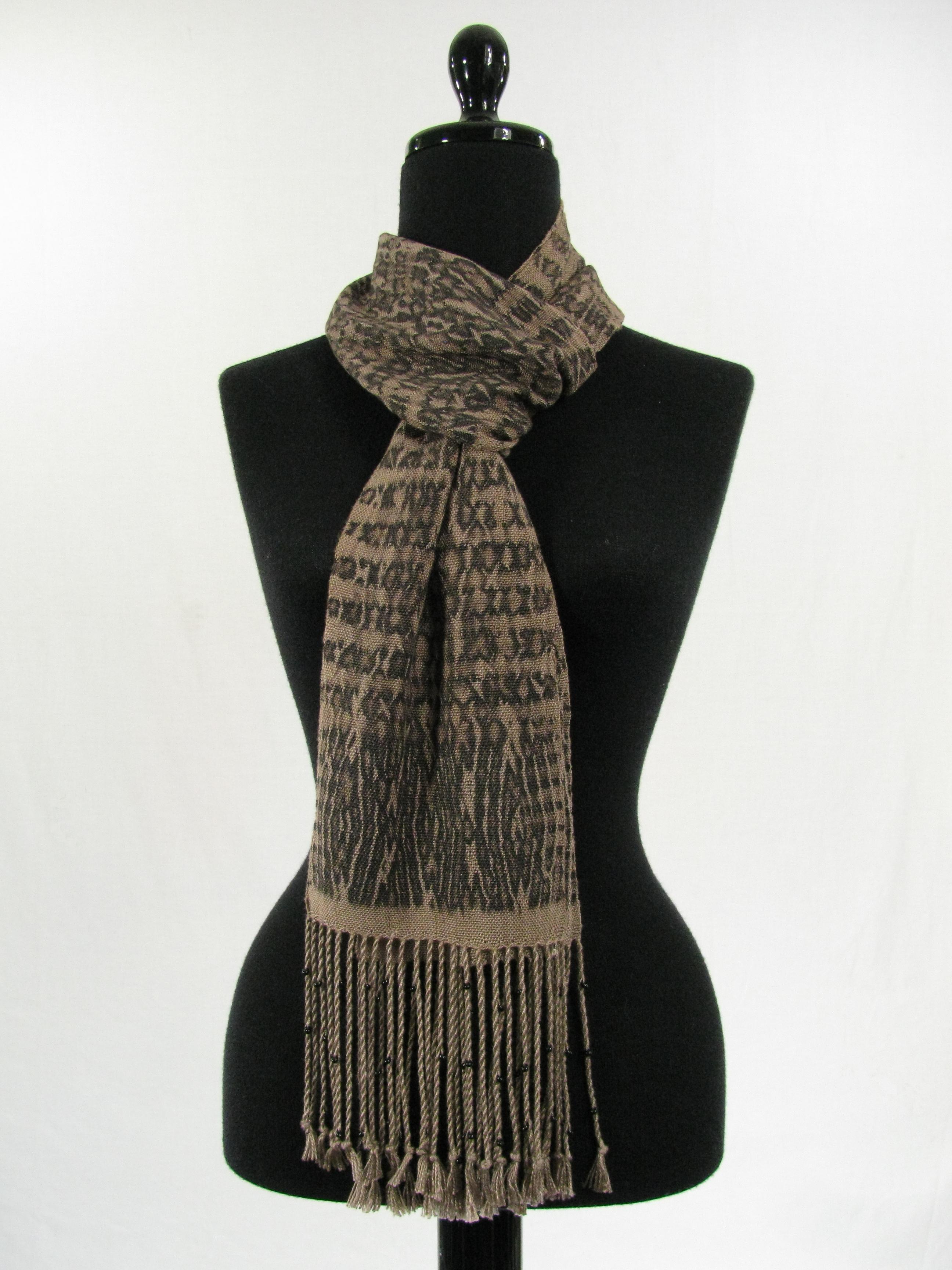 Rustic Shibori Scarf Handwoven Shibori Scarf. With twisted fringe and glass beads. 100% Rayon. 7 x 75 inches. Leave a comment Cancel reply Δ